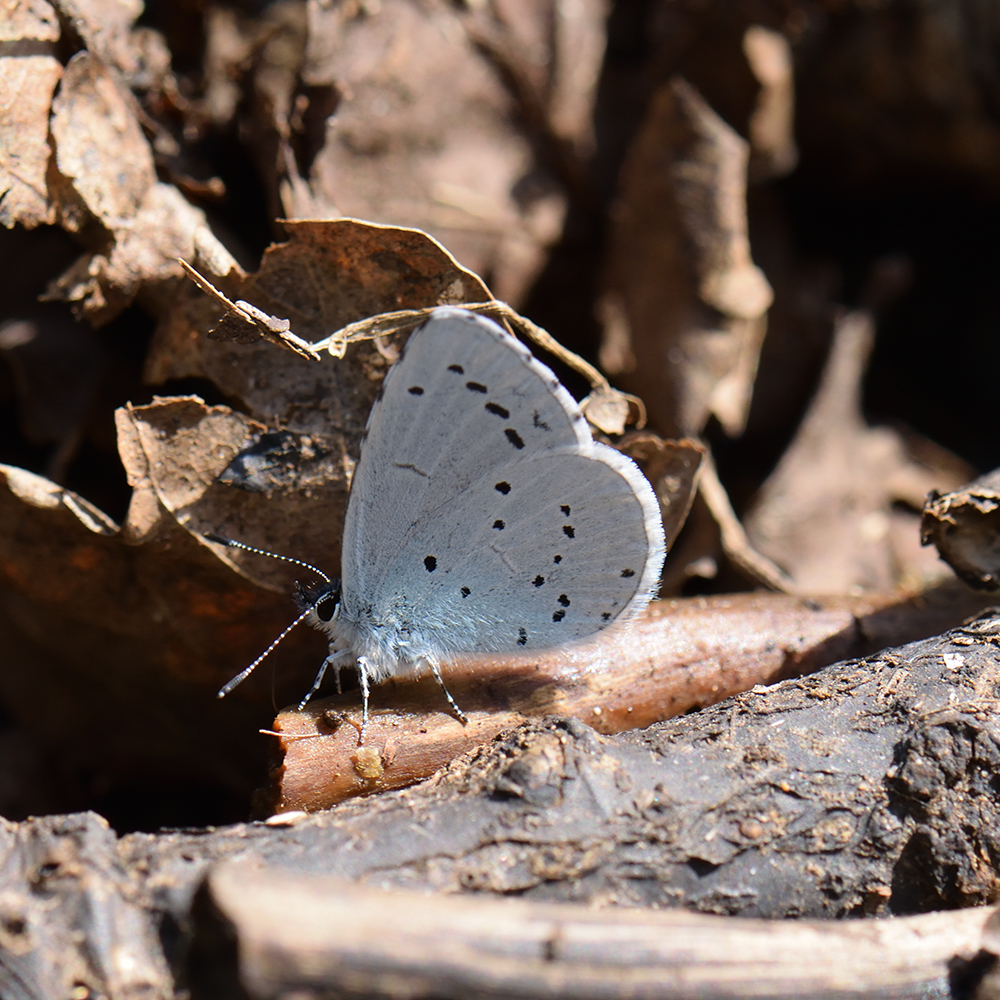 Faulbaum-Bläuling (Celastrina argiolus) auf Waldboden