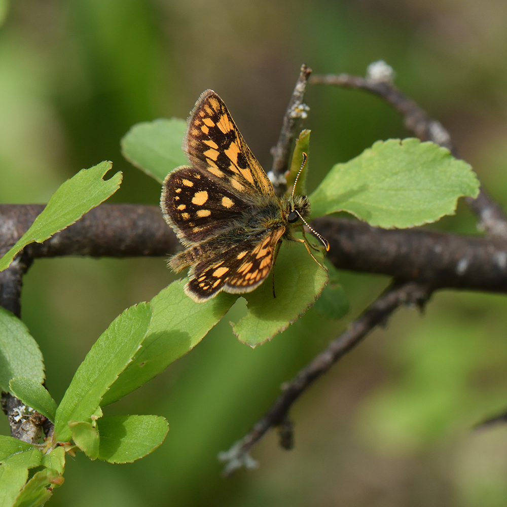 Gelbwürfeliger Dickkopffalter (Carterocephalus palaemon) auf Schlehe