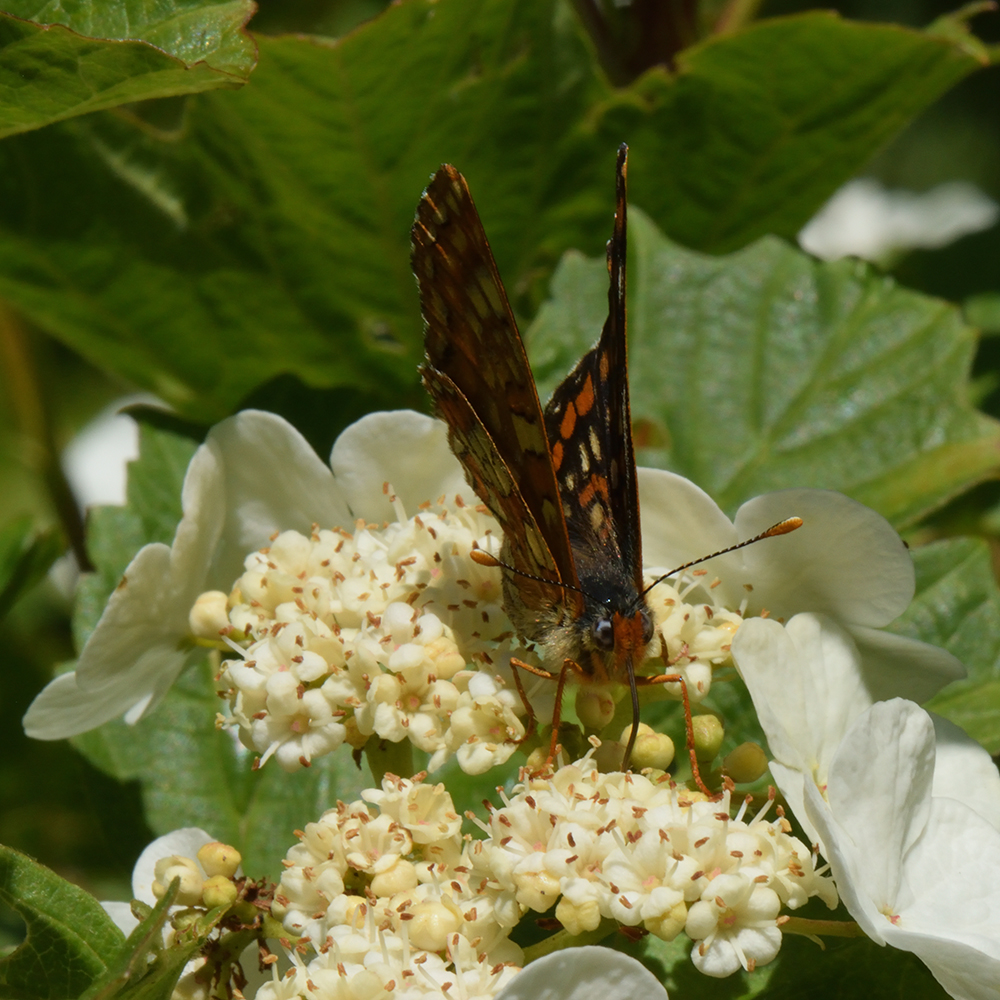Eschen-Scheckenfalter (Euphydryas maturna) auf Gewöhnlichem Schneeball