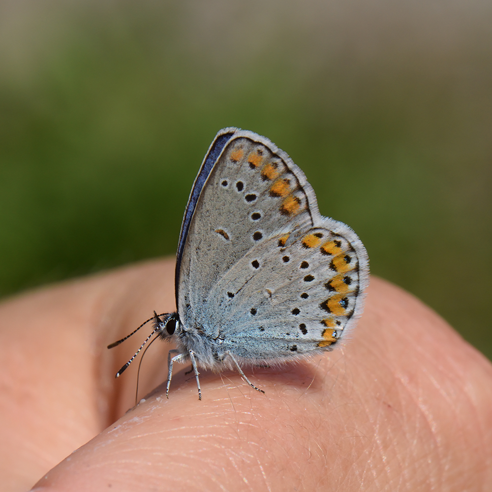 Kronwicken-Bläuling (Plebejus argyrognomon) auf Hand