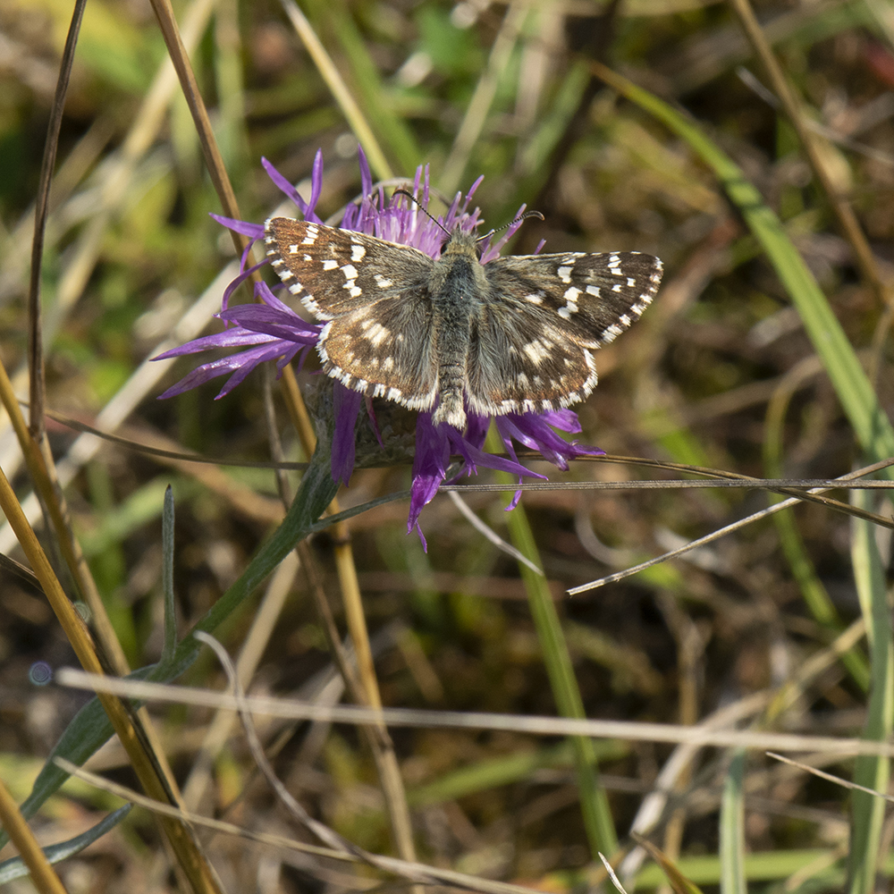 Spätsommer-Würfel-Dickkopffalter (Pyrgus cirsii) auf Flockenblume