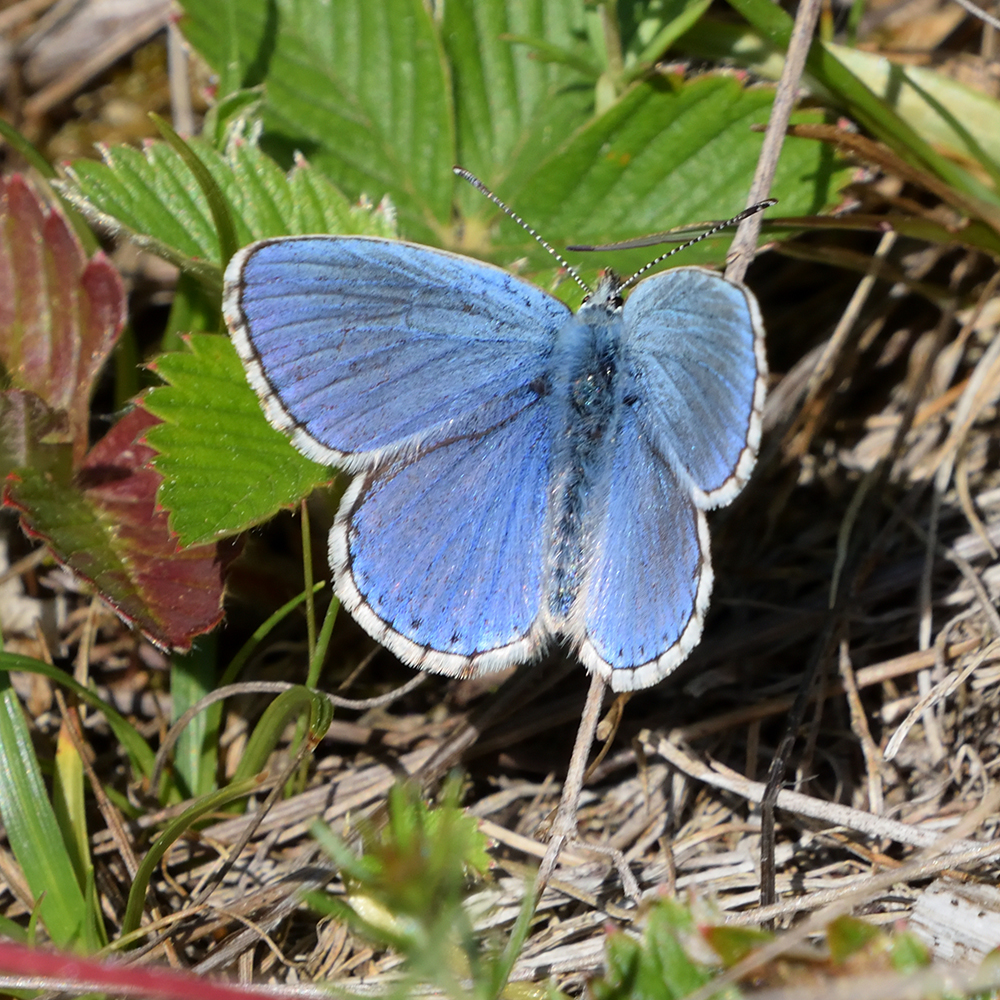 Himmelblauer Bläuling (Lysandra bellargus) auf Walderdbeerblatt