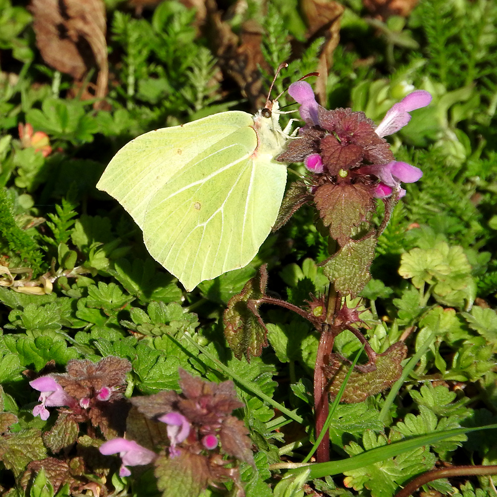 Zitronenfalter (Gonepteryx rhamni) auf roter Taubnessel