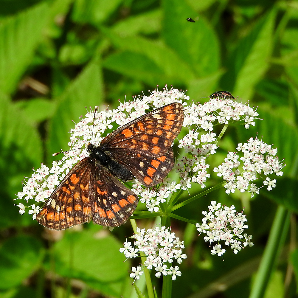 Eschen-Scheckenfalter (Euphydryas maturna) auf Gierschblüte