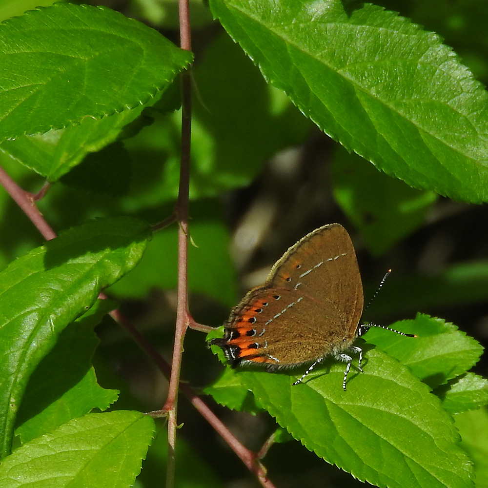 Pflaumen-Zipfelfalter (Satyrium pruni) am Waldrand
