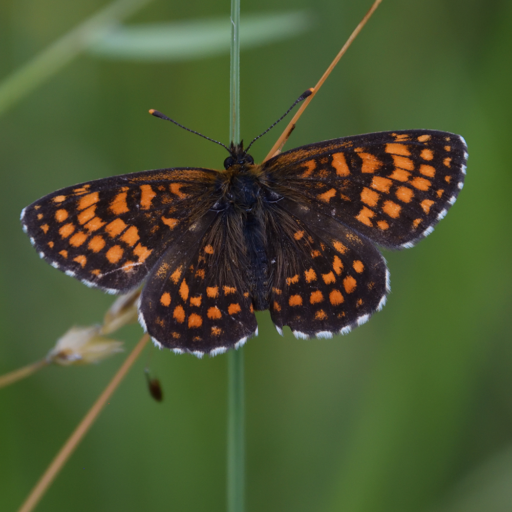Wachtelweizen-Scheckenfalter (Melitaea athalia) auf Gras